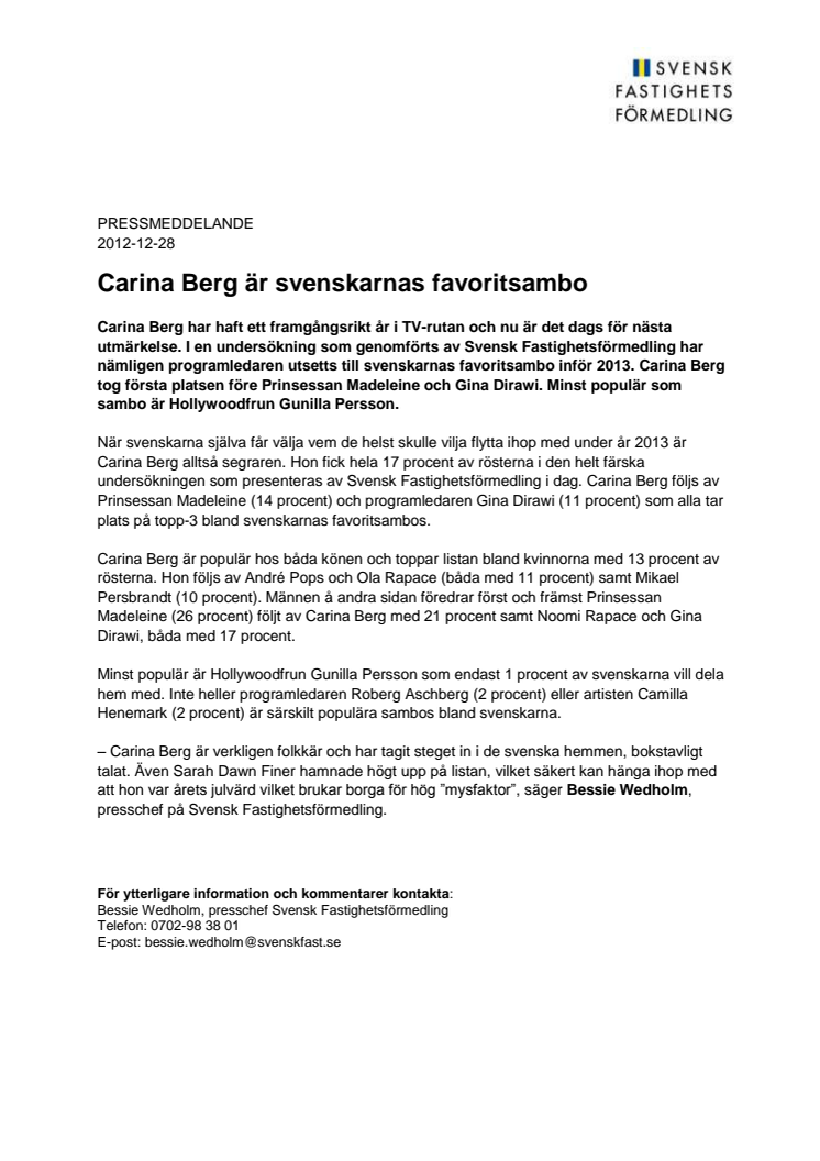 Carina Berg har haft ett framgångsrikt år i TV-rutan och nu är det dags för nästa utmärkelse. I en undersökning som genomförts av Svensk Fastighetsförmedling har nämligen programledaren utsetts till svenskarnas favoritsambo inför 2013. Carina Berg tog första platsen före Prinsessan Madeleine och Gina Dirawi. Minst populär som sambo är Hollywoodfrun Gunilla Persson.
