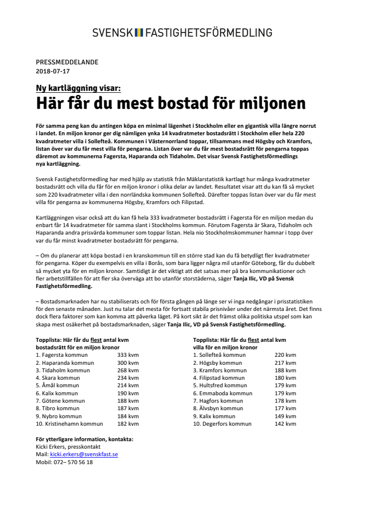 För samma peng kan du antingen köpa en minimal lägenhet i Stockholm eller en gigantisk villa längre norrut i landet. En miljon kronor ger dig nämligen ynka 14 kvadratmeter bostadsrätt i Stockholm eller hela 220 kvadratmeter villa i Sollefteå. Det visar Svensk Fastighetsförmedlings nya kartläggning.