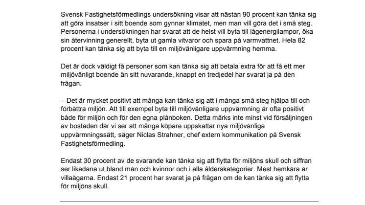- Det är mycket positivt att många kan tänka sig att i många små steg hjälpa till och förbättra miljön. Att till exempel byta till miljövänligare uppvärmning är ofta positivt både för miljön och för den egna plånboken. Detta märks inte minst vid försäljningen av bostaden där vi ser att många köpare uppskattar nya miljövänliga uppvärmningssätt, säger Niclas Strahner, chef extern kommunikation på Svensk Fastighetsförmedling.