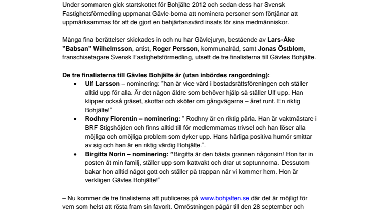 – Nu kommer de tre finalisterna att publiceras på www.bohjalten.se där det är möjligt för vem som helst att rösta fram sin favorit. Omröstningen pågår till den 28 september och därefter koras Gävles Bohjälte 2012. Denna person har sedan chansen att bli Svensk Fastighetsförmedlings Bohjälte 2012 och får en resa för två till Svenska Hjältar-galan i Stockholm, säger Jonas Östblom, franchisetagare på Svensk Fastighetsförmedling i Gävle.