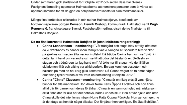 – Vi fick in jättemånga fina nomineringar varav juryn har valt ut tre. Röstningen har startat och på www.bohjalten.se kan vem som helst rösta fram sin favorit. Omröstningen pågår fram till den 28 september och därefter koras Halmstads Bohjälte 2012. Omöstningen har startat och på www.bohjalten.se kan vem som helst, fram till den 28 september, rösta fram sin favorit. Därefter koras Halmstads Bohjälte 2012. Denna person har sedan chansen att bli Svensk Fastighetsförmedlings Bohjälte 2012 och får en resa för två till Svenska Hjältar-galan i Stockholm, säger Pugh Rengensjö, franchisetagare på Svensk Fastighetsförmedling i Halmstad.