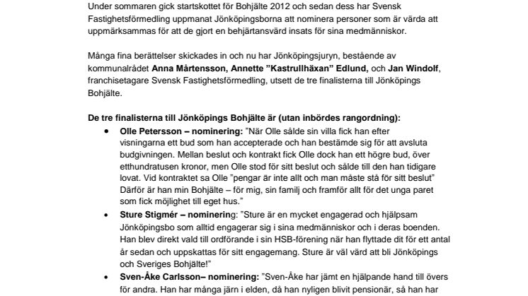 – De tre finalisterna för Jönköping är alla värdiga Bohjältar, och de ska bli kul att se hur svenska folket röstar. På www.bohjalten.se har vem som helst möjlighet att rösta fram sin favorit. Omröstningen pågår till den 28 september och därefter koras Jönköpings Bohjälte 2012. Denna person har sedan chansen att bli Svensk Fastighetsförmedlings Bohjälte 2012 och får en resa för två till Svenska Hjältar-galan i Stockholm, säger Jan Windolf, franchisetagare på Svensk Fastighetsförmedling i Jönköping.