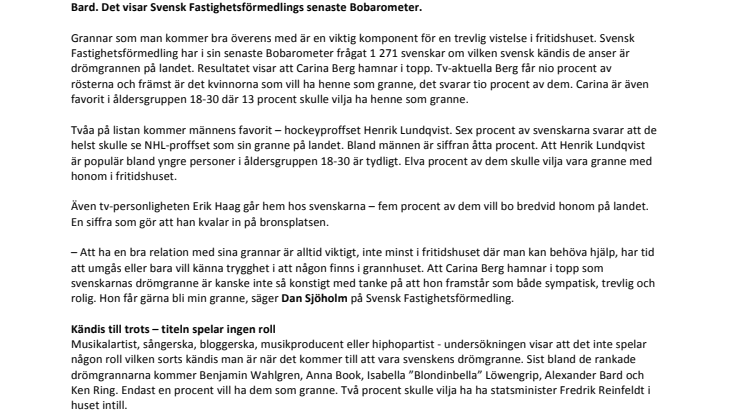 Om svenskarna får välja vilken svensk kändis de skulle vilja bo nära på landet står det klart att tv-profilen Carina Berg är drömgrannen, därefter kommer hockeyproffset Henrik Lundqvist. I botten bland de rankade drömgrannarna återfinns bland annat Benjamin Wahlgren, Isabella ”Blondinbella” Löwengrip och Alexander Bard. Det visar Svensk Fastighetsförmedlings senaste Bobarometer.